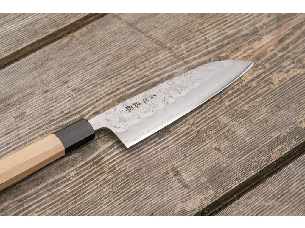 Na horní části čepele zůstaly neleštěné, krásné a jedinečné promáčkliny po kladivu. Ve spodní části čepele můžeme vidět velmi výraznou, zakřivenou linii, která prochází po celé délce čepele. Toto je linie mezi jádrem a dvěma měkčími vnějšími vrstvami oceli, které slouží jako dodatečná ochrana jádrové oceli. Takový sendvič z tvrdší jádrové oceli a měkčích vnějších ocelí se nazývá san-mai. Většina dnešních japonských nožů se vyrábí právě tímto způsobem.