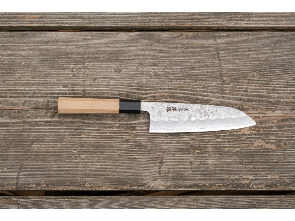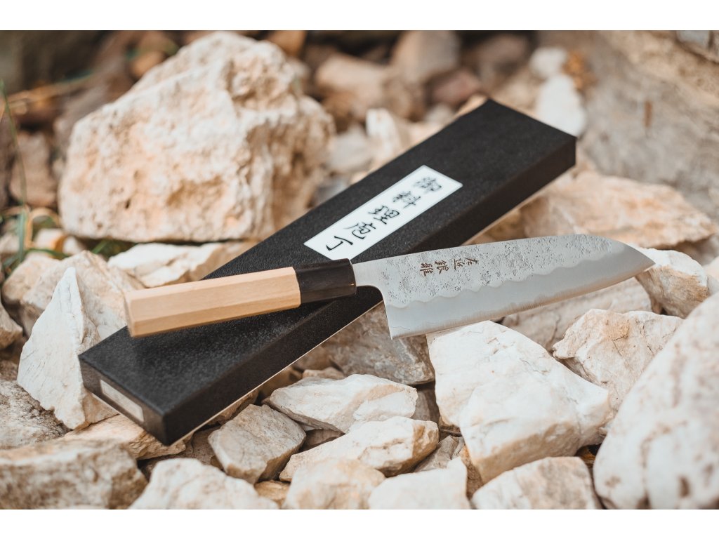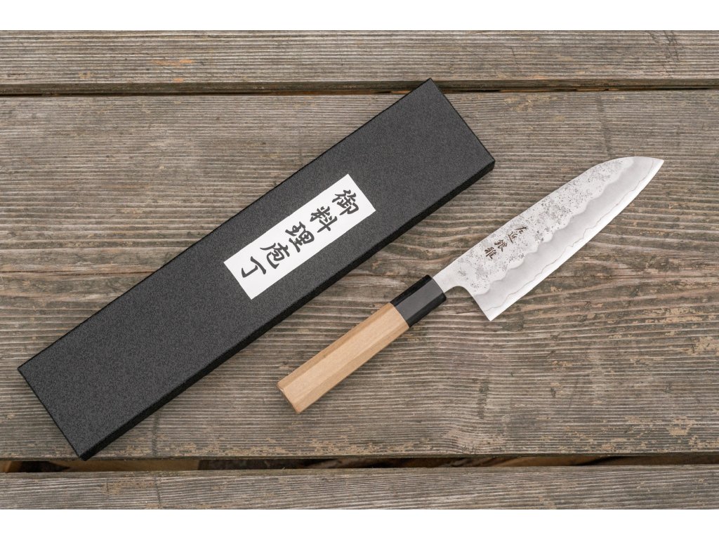 Víceúčelový japonský kuchyňský nůž, většinou vhodný pro použití v domácí kuchyni. Nože Santoku jsou nejběžněji používané nože v japonských domácích kuchyních a v posledních letech dobyly i zbytek světa. Toto Santoku od kovárny Hokiyama poslouží všem, kteří hledají menší a všestranný nůž s trochu větším důrazem na přípravu zeleniny. Nůž se bude vynikat při nejrůznějším sekání a krájení na prkénku, ale na opravdu větší kusy masa mu bude chybět potřebná délka čepele.
